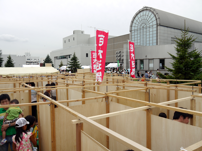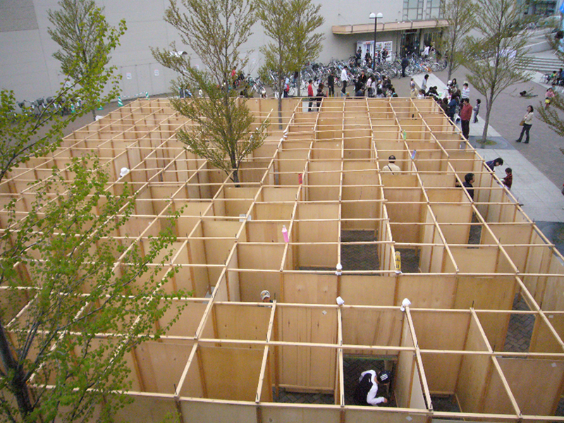 木製の材料を組み上げていく設営方法のため、会場の広さに合わせた迷路ができ上がります。コースの設定も比較的自由にできますので、参加者の年齢に合わせた巨大迷路ができあがります。トンネルや見晴らし台・迷路内ゲームなどのオプションもありますので、子どもたちには一日中楽しめる特別なあそび場になります。